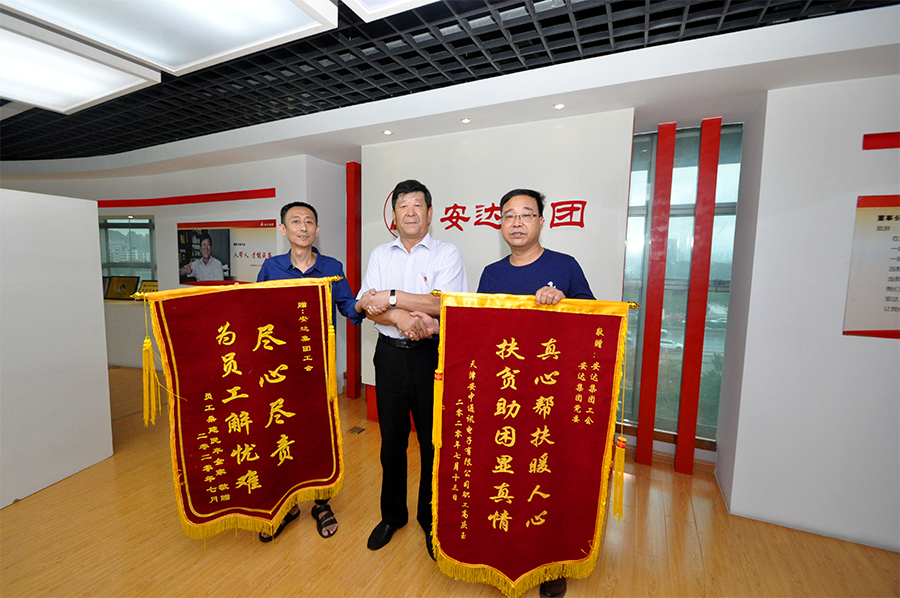 8月24日,鴻達精工機械有限公司職工桑建民、安中通訊電子有限公司職工高慶玉,作為困難職工代表來到安達集團,分別將繡有“真心幫扶暖人心,扶貧助困顯真情”,“盡心盡責,為員工解憂難”的錦旗送到了安達集團黨委書記、董事長崔洪金,工會主席鄭寶彥的手中,感謝安達黨委、工會對他們的真心關懷和幫助。