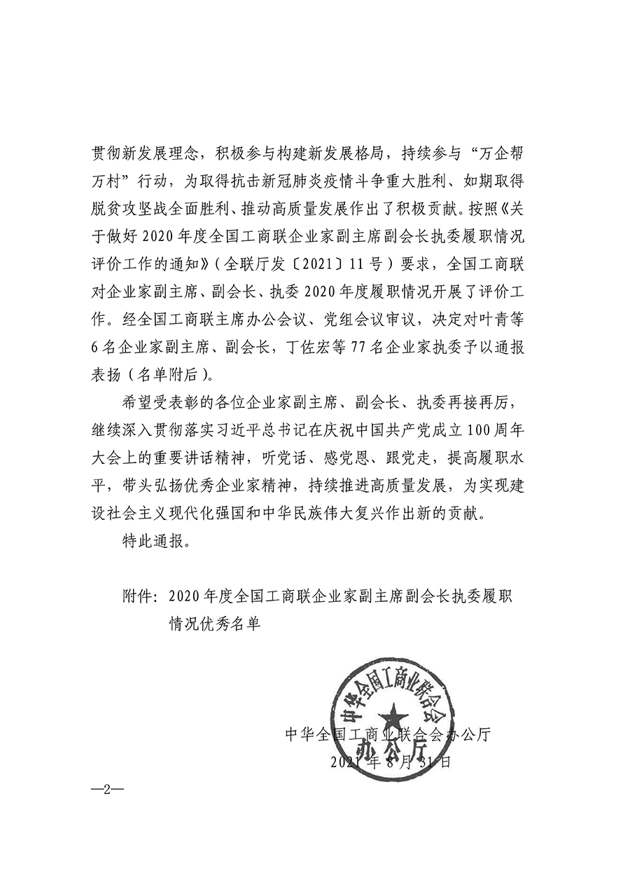 近日,全國工商聯發布《關于對2020年度履職情況優秀的全國工商聯企業家副主席副會長執委給予表揚的通報》。《通報》指出,2020年度面對突如其來的新冠肺炎疫情沖擊影響,各位企業家副主席、副會長、執委認真學習貫徹習近平新時代中國特色社會主義思想,以實際行動響應中央號召,積極投身抗擊疫情狙擊戰,統籌做好疫情防控和復工復產,主要服務“六穩”“六保”,認真貫徹新發展理念,積極參與構建新發展格局,持續參與“萬企幫萬村”行動,為取得抗擊新冠肺炎疫情斗爭重大勝利、如期取得脫貧攻堅戰全面勝利、推動高質量發展作出了積極貢獻。按照《關于做好2020年度全國工商聯企業家副主席副會長執委履職情況評價工作的通知》要求,全國工商聯對企業家、副主席、副會長、執委2020年度履職情況開展了評價工作。經全國工商聯主席辦公室會議、黨組會議審議,決定對葉青等6名企業家副主席、副會長,丁佐宏等77名企業家執委予以通報表揚。