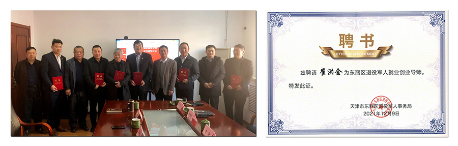 崔洪金董事長獲得區退役軍人事務局頒發的就業創業導師證書