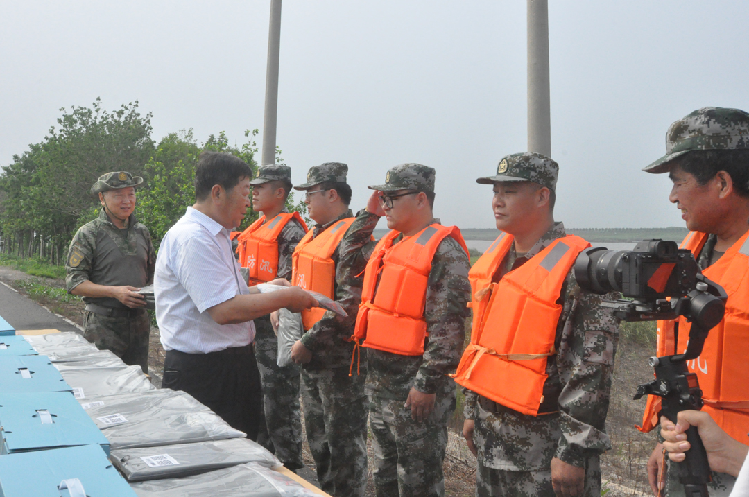 崔洪金現場了解民兵生活、排險情況,向堅守河堤的民兵表示崇高敬意,并為民兵送上夏季訓練服裝和防暑降溫慰問品,對他們發揚“聞‘汛’而動、聽令而行、勇于奉獻”的精神高度贊揚。