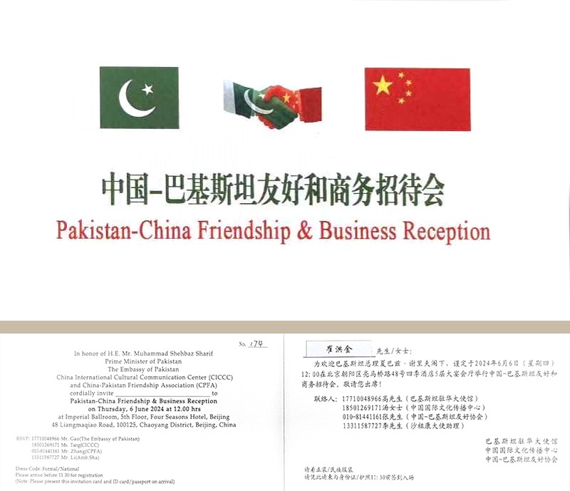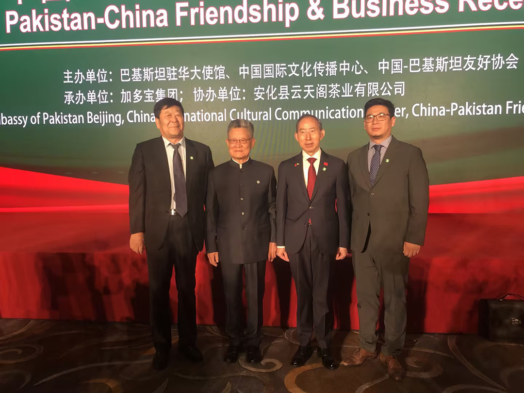 2024年6月6日,由巴基斯坦駐華使館、中國國際文化傳播中心和中國—巴基斯坦友好協(xié)會共同主辦的中國—巴基斯坦友好和商務招待會在京舉辦。正在中國訪問的巴基斯坦總理夏巴茲·謝里夫出席招待會并致辭。前聯(lián)合國副秘書長沙祖康、中國人民對外友好協(xié)會副會長李希奎、中國國際文化傳播中心執(zhí)行主席龍宇翔,巴基斯坦副總理兼外長達爾、巴基斯坦駐華大使卡里爾·哈什米出席活動,安達集團黨委書記、董事長、中國愛心工作委員會副主席、中巴協(xié)會理事崔洪金,安達集團總經(jīng)理崔文連受邀參會。
